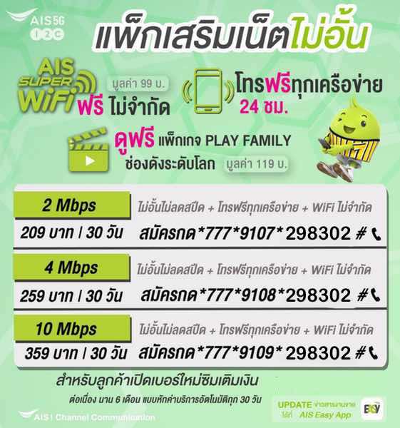 โปรเน็ต AIS รายเดือน ไม่อั้น ไม่ลดสปีด เร็ว 4 Mbps + โทรฟรีทุกเครือข่าย +WiFi ไม่จำกัด 259 บาท สมัครกด*777*9108*298302#โทรออก