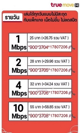 เน็ตไม่ลดสปีด ทรูมูฟเอช รายวัน 25 บาท สมัครกด *900*3704*17807206# โทรออก เน็ตไม่ลดสปีด ทรูมูฟเอช เน็ตความเร็วสูงสุด 1 Mbps ตลอด ใช้งานนาน 24 ชั่วโมง หรือ รายวัน ราคา 25 บาท รวมภาษี=26.75 บาท