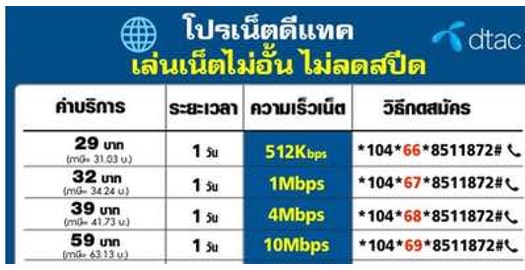 โปรเน็ค DTAC ดีแทค 1Mbps 4 Mbps 10 Mbps1วัน 24ชั่วโมงไม่อั้นไม่ลดสปีด