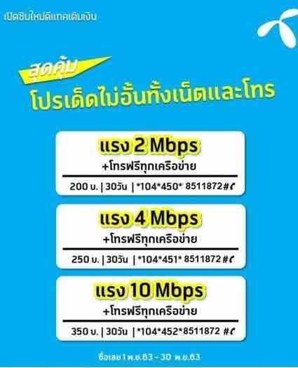 โปรเน็ต ดีแทค 10 Mbps สำหรับซิมใหม่ 1 เดือน 30 วัน