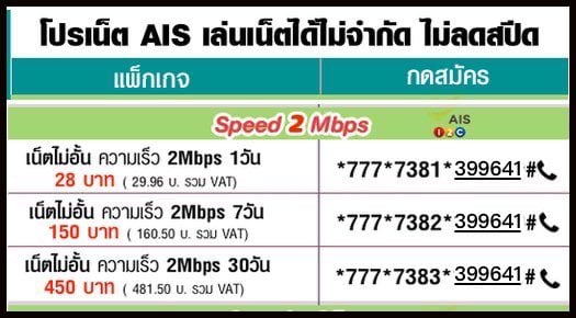 โปรเน็ต AIS วันทูคอล 2 Mbps 1 วัน 7 วัน 30 วัน ไม่อั้น ไม่ลดสปีด ==========================