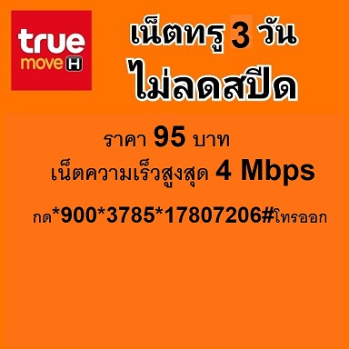 แพ็กเน็ตทรู 3 วัน ราคา 95 บาท เน็ตไม่อั้น 4 Mbps