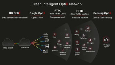 ในมหกรรมโมบายล์ เวิลด์ คองเกรส ประจำปี 2565 (Mobile World Congress 2022) คุณริชาร์ด จิน รองประธานบริษัทหัวเว่ย (Huawei) และประธานฝ่ายไลน์ผลิตภัณฑ์ธุรกิจระบบนำแสง ได้เปิดตัวเครือข่ายอัจฉริยะสีเขียวอ็อปติกซ์ (Green Intelligent OptiX Network) สำหรับองค์กร ซึ่งประกอบด้วยห้าโซลูชันสุดล้ำ ได้แก่ ใยแก้วสู่สำนักงาน (Fiber To The Office: FTTO), ใยแก้วสู่เครื่องจักร (Fiber To The Machine: FTTM), อ็อปติกซ์แบบเดี่ยว (Single OptiX), อ็อปติกซ์สำหรับศูนย์ข้อมูล (DC OptiX) และอ็อปติกซ์การตรวจจับ (Sensing OptiX) เพื่อส่งเสริมการเปลี่ยนผ่านสู่ดิจิทัลของอุตสาหกรรม