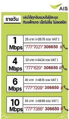 เน็ต AIS รายวัน 25 บาท เน็ตไมาจำกัด 1 Mbps รายยละเอียด -เล่นเน็ต AIS 5G 4G 3G ความเร็วสูงสุด 1 Mbps ตลอดการใช้งาน -ใช้งานนาน 24 ชั่วโมง หรือ รายวัน -ราคา 25 บาท รวมภาษี=26.75 บาท สมัครกด *777*7021*306650# โทรออก