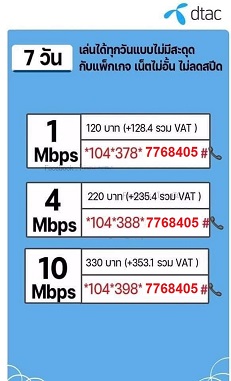 เน็ตดีแทค 120 บาท / สััปดาห์ เน็ตไม่อั้น สมัครกด *104*378*17807206# โทรออก รายละเอียด -ใช้งานอินเทอร์เน็ต ดีแทค ความเร็วสูงสุด 1 Mbps ตลอดการใช้งาน -ระยะเวลาการใช้งานนาน 1 สัปดาห์ หรือ 7 วัน -ราคา 120 บาท รวมภาษี=128.4 บาท -สำหรับซิมเติมเงิน ดีแทค -ระยะเวลารับสิทธิ์ 52 รอบ