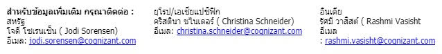 เกี่ยวกับค็อกนิแซนท์ ค็อกนิแซนท์ (Nasdaq: CTSH) วางแผนจัดการธุรกิจที่ทันสมัย โดยช่วยลูกค้าของเราปรับปรุงเทคโนโลยีให้ทันสมัย วางขั้นตอนต่าง ๆ ขึ้นใหม่ และพลิกโฉมประสบการณ์เพื่อให้ลูกค้านำหน้าในโลกที่มีการเปลี่ยนแปลงอย่างรวดเร็วของเราได้ เราปรับปรุงชีวิตประจำวันให้ดีขึ้นไปด้วยกัน ดูผลงานของเราได้ที่ www.cognizant.com หรือ @cognizant