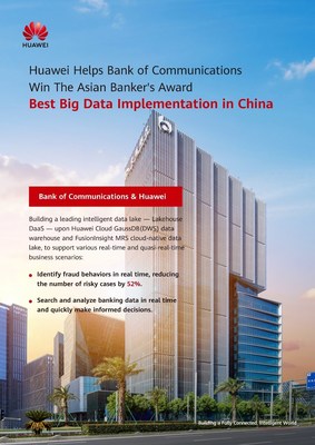 ดิ เอเชียน แบงเกอร์ (The Asian Banker) นิตยสารการเงินชั้นนำระดับโลกที่ให้ข้อมูลเชิงลึกเกี่ยวกับอุตสาหกรรมการเงิน ได้ประกาศรายชื่อผู้ชนะรางวัลเทคโนโลยีทางการเงิน (Financial Technology Awards) ประจำปี 2565 ในงานไฟแนนซ์ ไชน่า (Finance China 2022) โดยผลปรากฏว่า ธนาคารแห่งการสื่อสาร (Bank of Communications) คว้าราวัลในสาขาการใช้งานบิ๊กดาต้ายอดเยี่ยม (Best Big Data Implementation) จากโซลูชัน Lakehouse DaaS ที่ใช้พื้นที่เก็บข้อมูลอัจฉริยะ Huawei Cloud FusionInsight ของหัวเว่ย