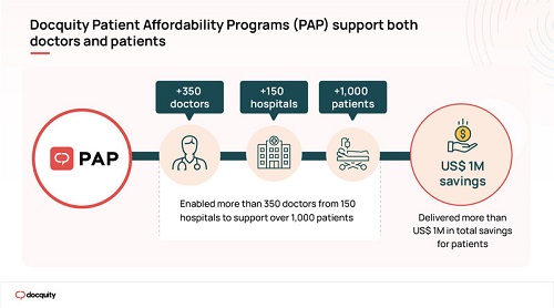 เพื่อสนับสนุนแนวนโยบายของรัฐบาลฟิลิปปินส์ในการส่งเสริมการดูแลสุขภาพถ้วนหน้า ด็อกควิตี้ (Docquity) คอมมูนิตี้ทางการแพทย์ที่ใหญ่ที่สุดของเอเชียตะวันออกเฉียงใต้ จึงได้คิดค้นโครงการสนับสนุนการเข้าถึงยา (Patient Affordability Program: PAP) ระบบดิจิทัลในประเทศฟิลิปปินส์ เพื่อสนับสนุนการทำงานของแพทย์ในการรับรองผลการรักษาที่ดีขึ้นสำหรับผู้ป่วยโรคมะเร็ง โดยเฉพาะอย่างยิ่งผู้ที่ต้องการความช่วยเหลือทางการเงิน ด็อกควิตี้ พีเอพี (Docquity PAP) อำนวยความสะดวกให้แก่แพทย์ในการให้คำปรึกษาทางไกลที่เชื่อถือได้ ซึ่งช่วยปรับปรุงการบริหารจัดการและการดูแลติดตามผู้ป่วยโดยรวม ลงทะเบียนผู้ป่วยเข้าสู่เครือข่ายร้านขายยาที่ขยายครอบคลุมมากขึ้น เพื่อให้ผู้ป่วยทั่วทุกพื้นที่สามารถเข้าถึงยาราคาไม่แพง และช่วยให้บริษัทยาในเครือข่ายสามารถปรับปรุงการดำเนินงานให้เป็นระบบดิจิทัลและมีประสิทธิภาพมากขึ้นอย่างปลอดภัย