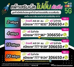 เน็ตไม่อั้น AIS 300 บาท / เดือน สมัครกด *777*9124*306650# โทรออก -เน็ตไม่อั้น AIS ความเร็วสูงสุด 20 Mbps ตลอดการใช้งาน -ฟรี AIS WiFi ไม่จำกัด -ใช้งานนาน 30 วัน หรือ 1 เดือน -ราคารวมภาษี=300 บาท -สมัครต่อเนื่อง 6 เดือน เดือนถัดไปเพียงเติมเงิน 150 บาท ระบบจะทำการตัดเงินอัตโนมัติเพื่อต่ออายุการใช้งาน