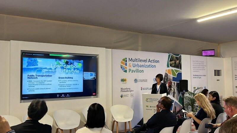 ในการประชุม COP28 ผู้อำนวยการฉางได้ถ่ายทอดถ้อยแถลงของนายกเทศมนตรีเฉิน ฉี-ม่าย ซึ่งระบุว่า การลดคาร์บอนเป็นกระบวนการที่กำลังดำเนินอยู่และเป็นแนวโน้มแห่งอนาคต ในฐานะที่เป็นเมืองอุตสาหกรรม การปล่อยคาร์บอนของเมืองเกาสงคิดเป็นสัดส่วนสูงถึง 20% ของทั้งหมดในไต้หวัน ดังนั้น เมืองเกาสงจึงมุ่งมั่นอย่างเต็มที่เพื่อบรรลุเป้าหมายปล่อยคาร์บอนสุทธิเป็นศูนย์ ภายใต้การนำของนายกเทศมนตรีเฉิน หน่วยงานต่าง ๆ พร้อมใจกันลดการปล่อยก๊าซเรือนกระจกในเมืองเกาสง ทั้งนี้ ในปี 2564 เมืองเกาสงปล่อยคาร์บอนลดลง 13.2% เมื่อเทียบกับปี 2548 โดยลดคาร์บอนได้ 8.77 ล้านเมตริกตัน ซึ่งเกินกว่าเป้าหมายระดับชาติปี 2568 (10%) นอกจากนี้ เมืองเกาสงได้จัดตั้ง "พันธมิตรอุตสาหกรรมคาร์บอนสุทธิเป็นศูนย์" (Industrial Net Zero Alliance) เมื่อปีที่แล้ว และออก "กฎหมายปกครองตนเองของเมืองเกาสงว่าด้วยการพัฒนาเมืองคาร์บอนสุทธิเป็นศูนย์" (Kaohsiung Net Zero City Development Autonomous Ordinance) ในเดือนมิถุนายน พร้อมเปิดสำนักงานใหญ่ของ "ตลาดซื้อขายคาร์บอน" (Carbon Trading Exchange) อย่างเป็นทางการในเดือนสิงหาคม และเปิด "สถาบันคาร์บอนสุทธิเป็นศูนย์" (Net Zero Institute) แห่งแรกของไต้หวันในเกาสง นิวเบย์ สตาร์ตอัป เทอร์เรซ (Kaohsiung New Bay Startup Terrace) เมื่อเดือนพฤศจิกายน โดยมีเป้าหมายเพื่อพัฒนาบุคลากรด้านการจัดการคาร์บอนให้เป็นที่ยอมรับในระดับสากล รวมถึงอำนวยความสะดวกในการสร้างความร่วมมือแบบสหวิทยาการระหว่างอุตสาหกรรม รัฐบาล สถานศึกษา และศูนย์วิจัย ตลอดจนสร้างห่วงโซ่อุตสาหกรรมการเปลี่ยนผ่านสู่ดิจิทัลและการปล่อยคาร์บอนสุทธิเป็นศูนย์ เพื่อบรรลุเป้าหมายการปล่อยคาร์บอนสุทธิเป็นศูนย์ปี 2593