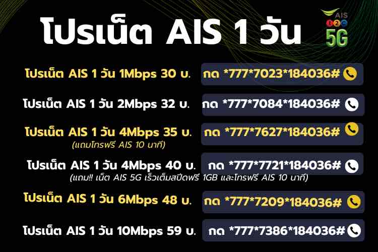 โปรโมชั่นเน็ต AIS ไม่ลดสปีด 2025 โปรโมชั่น AIS รายวัน สำหรับสมาร์ทโฟน โปรเน็ต AIS ถูก ดังนี้