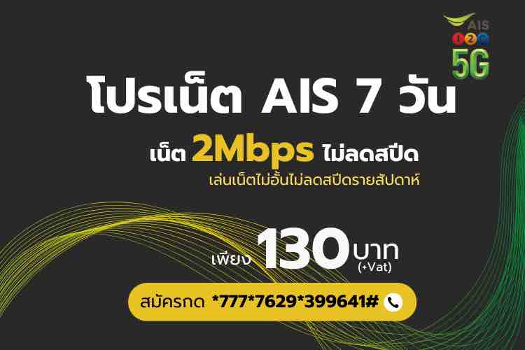 สมัครโปรเน็ต AIS ไม่ลดสปีด รายวัน 130 บาท เน็ตไม่อั้น 2Mbps สมัครกด *777*7629*399641# โทรออก