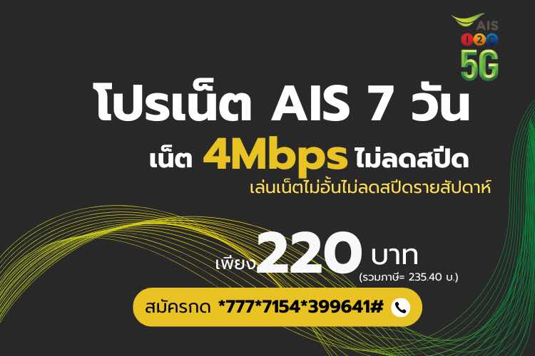 สมัครโปรเน็ต AIS ไม่ลดสปีด รายสัปดาห์ 220 บาท เน็ตไม่อั้น 4Mbps สมัครกด *777*7154*399641# โทรออก