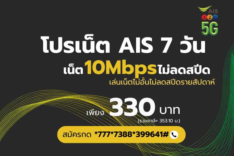 สมัครโปรเน็ต AIS ไม่ลดสปีด รายวัน 330 บาท เน็ตไม่อั้น 10Mbps สมัครกด *777*7388*399641# โทรออก