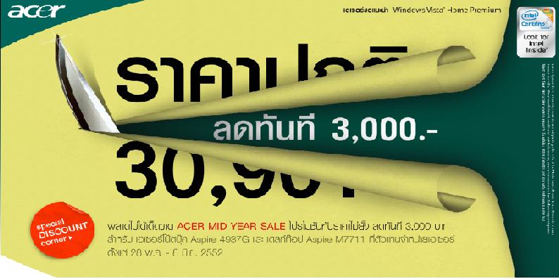 เราได้ข่าวมาว่า Acer เค้ากำลังโปรโมชั่นลดของmidyear sale ล่ะ ใครสนใจต้องการ laptop ก็ไปถามได้ที่ บูธของ ACER หรือไม่ก็ถามได้ที่ call center 02-685-431 เค้าลดวันนี้ถึง 8 มิ.ย.เองนะ ลด 3000 บาท สำหรับ Acer Notebook Aspire 4937G และ Desktop Aspire M7711 อย่าพลาดน้า http://www2.acer.co.th/backend/backoffice/webcms/website/3_27.05.2009/index.html