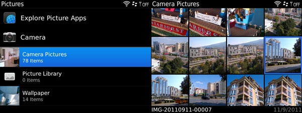 อีก 1 ฟังก์ชั่นที่ยังมี UI เหมือนเดิม นั่นคือ Gallery ซึ่งน่าเสียดายที่ BlackBerry Bold Touch 9900 นั้น ไม่มีฟังก์ชั่น accelerometer หรือการหมุนภาพแบบอัตโนมัติ แต่เมื่อพูดถึงความสามารถในการ browse รูป และการซูมรูปนั้น ถือว่า ทำได้ดีเลยทีเดียว