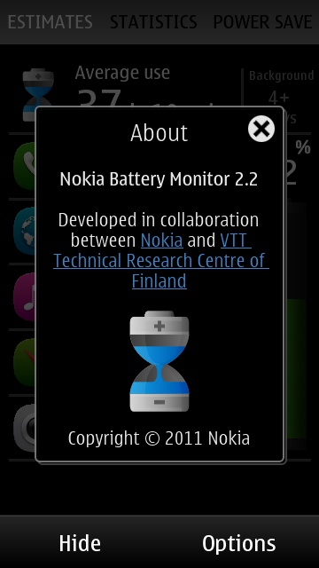 ด้วยความสามารถที่เพิ่มขึ้นของสมาร์ทโฟนในปัจจุบัน ทำให้ความถี่ในการใช้สมาร์ทโฟนมีจำนวนครั้งที่มากขึ้น เมื่อเทียบกับโทรศัพท์มือถือรุ่นก่อนๆ ที่ทำหน้าที่ได้เพียงแค่รับสาย และโทรออกเท่านั้น จึงทำให้ผู้ใช้สมาร์ทโฟนในปัจจุบัน จำเป็นต้องมีแบตเตอรี่สำรอง หรือชาร์ตแบตเตอรี่บ่อยครั้งขึ้น เพื่อรองรับการใช้งานที่มากขึ้นนั่นเอง ด้วยเหตุนี้ ทาง โนเกีย ได้ร่วมกับ VTT Technical Research Center ในประเทศฟินแลนด์ พัฒนาแอพพลิเคชั่นที่มีชื่อว่า Nokia Battery Monitor ซึ่งเป็นแอพพลิเคชั่นสำหรับซิมเบี้ยนโฟนโดยเฉพาะ มีไว้เพื่อประมาณระยะเวลาการใช้งานของสมาร์ทโฟน ในกรณีที่แบตเตอรี่เหลือน้อยและจำกัด โดยแอพพลิเคชั่น Nokia Battery Monitor นั้น จะทำการคำนวณจำนวนชั่วโมงที่สามารถใช้งานได้ จากเปอร์เซ็นต์ของแบตเตอรี่ที่คงเหลืออยู่ในตัวเครื่องนั่นเอง