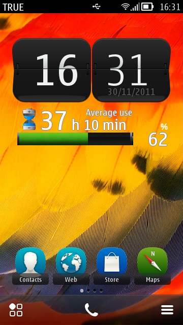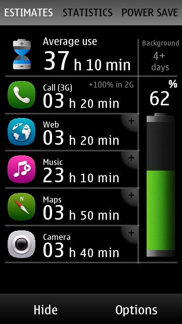 เมื่อดาวน์โหลดแอพพลิเคชั่น Nokia Battery Monitor มาใช้งานแล้ว ตัวโปรแกรมจะคำนวณระยะเวลาการใช้งานบนฟีเจอร์ต่างๆ จากเปอร์เซ็นต์ของแบตเตอรี่ที่เหลืออยู่ในตัวเครื่อง ซึ่งจากภาพด้านบนนั้น จะเห็นว่า แบตเตอรี่เหลืออยู่ในตัวเครื่องประมาณ 62% สามารถใช้งานได้สูงสุด 37 ชั่วโมง โดยแบ่งเป็น การใช้งานด้านโทรศัพท์ (3G) 3 ชั่วโมง, เล่นอินเทอร์เน็ต 3 ชั่วโมง, ฟังเพลงได้ 23 ชั่วโมง เป็นต้น