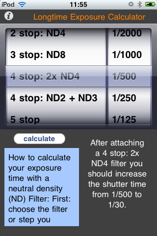 สำหรับผู้ที่ชื่นชอบการถ่ายรูปอยู่แล้ว จะทราบดีว่า ND Filter ถือเป็นปัจจัยหนึ่งที่ควรจะมีสำหรับการถ่ายภาพ ซึ่ง ND Filter นั้น จะช่วยลดปริมาณแสงของภาพ ในกรณีที่อยู่ในสถานที่ที่มีแสงแดดมากเกินไป และ Speed shutter ต่ำๆ ก็ไม่สามารถช่วยลดความสว่างของภาพได้เท่าที่ควร โดยแอพพลิเคชั่น Longtime Exposure Calculator มีฟังก์ชั่นของ ND Filter อยู่ในตัว ซึ่งช่วยคำนวณความไวของชัตเตอร์ให้ลดต่ำลง ตามจำนวนสต็อป ยกตัวอย่างเช่น ND8 จะลดลง 3 สต็อป เป็นต้น