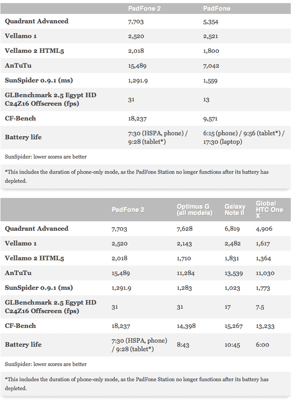ส่วนระยะเวลาการใช้งานแบตเตอรี่ ต่อการชาร์จให้เต็ม 1 ครั้งนั้น ก็มีการทดสอบและเปรียบเทียบด้วยเช่นกัน ซึ่งจากตารางด้านบน อาจจะเห็นว่า Asus PadFone 2 นั้นมีระยะเวลาการใช้งานน้อยกว่า Asus PadFone รุ่นแรกอยู่เล็กน้อย
