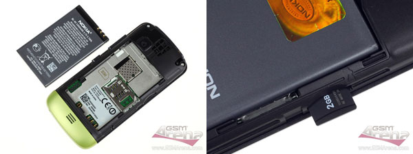 เมื่อแกะฝาหลังออก จะพบกับแบตเตอรี่ขนาด 1000mAh BL-4U ที่สามารถเปิดเครื่องสแตนด์บายได้นานถึง 576 ชั่วโมง และช่องสำหรับ MicroSD อยู่ทางด้านขวา ซึ่งจำเป็นต้องแกะฝาหลังเครื่องออกจึงจะสามารถนำ MicroSD ออกจากตัวเครื่องได้