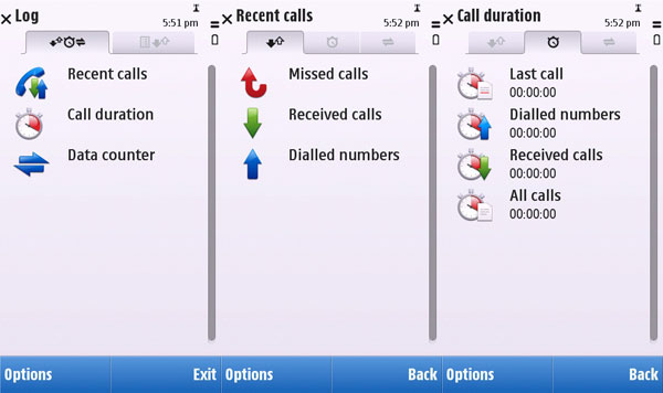 สำหรับบันทึกการโทร (Call Log) นั้น จะแบ่งออกเป็น 3 ส่วน ได้แก่ สายที่ไม่ได้รับ (Missed Calls), สายที่รับ (Received Calls) และสายที่โทรออก (Dialled Numbers) โดยแต่ละส่วนนั้นจะบันทึกการโทรได้ 20 สายแรก