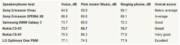 ตารางเปรียบเทียบความดังและชัดเจนของลำโพงระหว่าง Nokia C5-03 กับโทรศัพท์รุ่นอื่นๆ