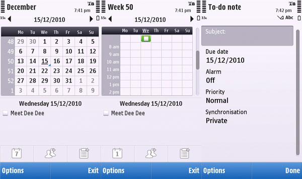 สำหรับปฏิทินนั้น มีทั้งหมด 4 โหมดด้วยกันคือ แบบรายเดือน, รายสัปดาห์, รายวัน และรายการที่ต้องทำ (To-do list) และสามารถตั้งค่าได้ทั้งหมด 4 แบบ คือ ประชุม (Meeting), โน๊ต (Memo), ครบรอบ (Anniversary) และรายการที่ต้องทำ (To-do) ซึ่งสามารถตั้งเสียงเรียกเตือนได้