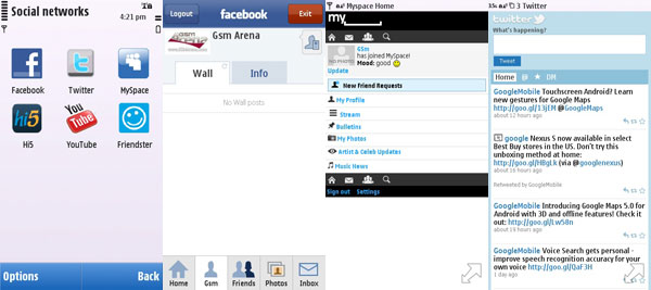 นอกจากนี้ยังมี Social Networking เด่นๆ อย่าง Facebook, Myspace, Twitter และ Hi5 อีกทั้งยังสามารถดาวน์โหลดเพิ่มเติมผ่านทาง Ovi Store ได้อีกด้วย