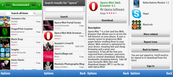 ภายใน Ovi Store นั้น มีแอพพลิเคชั่นให้เลือกหลายโหมด ไม่ว่าจะเป็น เกม, เพลง, วิดีโอ รวมไปถึงแอพพลิเคชั่นแนะนำ โดยสามารถดาวน์โหลดผ่านทางโทรศัพท์ได้โดยตรง หรือผ่านคอมพิวเตอร์แล้วค่อย Transfer ผ่านโปรแกรม PC Suite Application เข้าโทรศัพท์ในภายหลัง