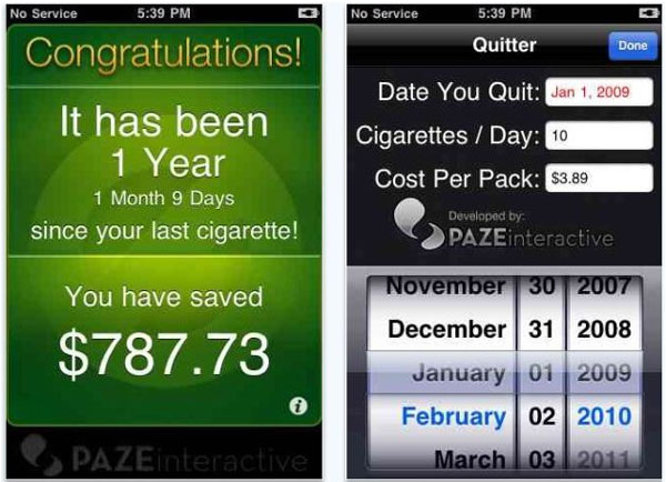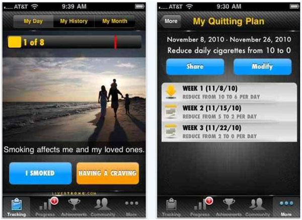 แอพพลิเคชั่นนี้เป็นการบันทึกประวัติการสูบบุหรี่ของผู้ใช้ ซึ่งได้ทำการตั้งเป้าหมายในการเลิกบุหรี่ให้น้อยลงในแต่ละสัปดาห์ นอกจากนี้แอพพลิเคชั่นยังเชื่อมต่อผ่าน Facebook, Twitter และ LIVESTRONG อีกด้วย