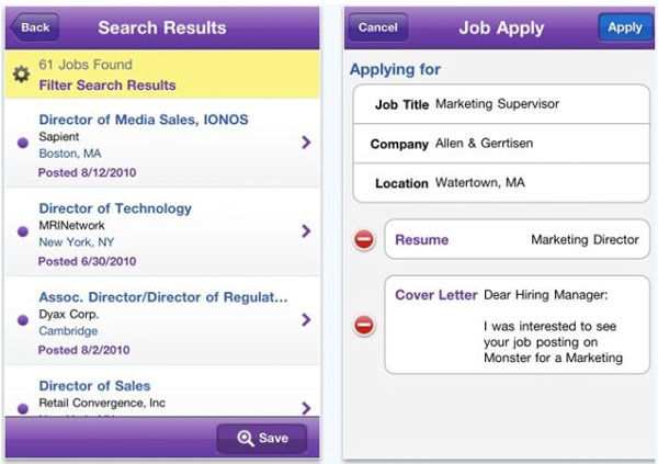 เว็บไซต์ Monster.com ถือว่าเป็นเว็บไซต์หางานรายใหญ่รายหนึ่ง โดยก่อนจะเริ่มใช้งานนั้น ผู้ใช้ต้องทำการสมัครสมาชิกเสียก่อน จากนั้นก็ทำการกรอกข้อมูลส่วนตัว รวมไปถึงการอัพเดตเรซูเม่ผ่านทาง iPhone ได้ นอกจากนี้ยังสามารถใช้ระบบ GPS ใน iPhone นั้นหางานที่อยู่ใกล้บ้านได้อีกด้วย