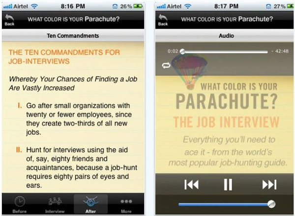 แอพพลิเคชั่นชื่อยาว แต่มากด้วยสาระ โดย What Color is Your Parachute? นั้น จะเป็นแหล่งรวมเคล็ดลับและวิธีที่ควรปฏิบัติและหลีกเลี่ยงในการสัมภาษณ์งาน ซึ่งถือว่าเป็นประโยชน์สำหรับผู้ที่กำลังจะสัมภาษณ์งานเป็นอย่างมาก