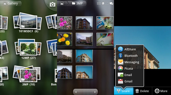 ในส่วนของ Gallery นั้น เหมือนกับอุปกรณ์อื่นที่ใช้ระบบปฏิบัติการแอนดรอยด์ โดยรูปภาพถูกเก็บไว้เป็นหมวดหมู่ อีกทั้งยังสามารถเรียงรูปภาพตามวันที่ได้ นอกจากนี้ มุมด้านขวาของหน้าจอนั้น จะมีปุ่มที่สามารถเปลี่ยนการแสดงรูปภาพ ให้เป็นแบบ Grid view หรือ Timeline view ได้ แล้วแต่ผู้ใช้จะเลือก อีกทั้ง Samsung Galaxy 551 ยังรองรับการสัมผัสแบบ Multi-touch จึงสามารถใช้ฟังก์ชั่น Pinch-to-Zoom ได้ หรือจะใช้การซูมแบบ Manual โดยการกดปุ่ม +/- ก็ได้
