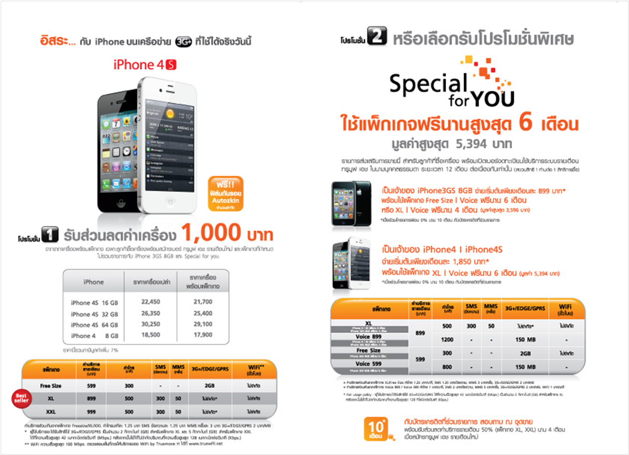 iPhone 4S รับส่วนลดค่าเครื่อง 1,000 บาท ฟรี ฟิลม์กันรอย Autozkin (จำนวนจำกัด) หรือ Special for YOU ใช้แพ๊กเกจฟรีนานสูงสุด 6 เดือน มูลค่าสูงสุด 5,394 บาท