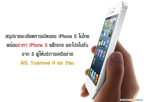 เปิดให้ผู้ที่สนใจ iPhone 5 ในประเทศไทย ได้เริ่มจับจองกันบ้างแล้ว เมื่อช่วงเที่ยงคืนของวันนี้ (26 ตุลาคม 2555) จากทั้ง 3 เครือข่ายผู้ให้บริการหลัก ซึ่งได้แก่ AIS, Dtac และ Truemove H โดยเมื่อช่วงเที่ยงคืนที่ผ่านมา ทั้ง 3 เครือข่ายต่างพร้อมใจกันขึ้นภาพของ iPhone 5 ที่หน้าเว็บไซต์เป็นที่เรียบร้อยแล้ว ซึ่งรายละเอียดการจอง และราคา iPhone 5 ของแต่ละเครือข่าย เป็นดังนี้