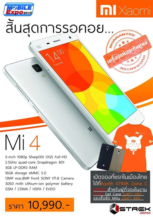 ท่านใดที่สนใจสั่งจอง Xiaomi Mi4 สามารถแวะมาลองสัมผัสกับตัวจริงเสียงจริงของ Xiaomi Mi4 กันได้ที่งาน Thailand Mobile Expo 2015 ระหว่างวันที่ 7-10 พฤษภาคม 2558 ณ ศูนย์การประชุมแห่งชาติสิริกิติ์ และแนะนำว่าอย่ารอช้า คงต้องรีบตัดสินใจกันสักหน่อย เพราะสินค้า และของแถมอาจมีจำนวนจำกัด