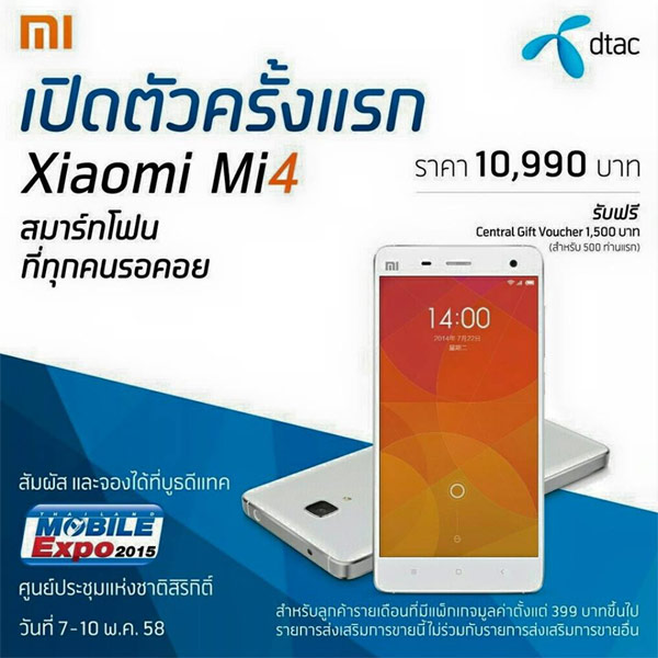 สั่งจอง Xiaomi Mi4 ราคา 10,990 บาท กับ dtac ภายในงาน TME 2015 ได้เฉพาะลูกค้า dtac ในระบบรายเดือนที่ใช้แพ็กเกจมูลค่าตั้งแต่ 399 บาทขึ้นไป พร้อมรับฟรี Central Gift Voucher มูลค่า 1,500 บาท สำหรับผู้ที่สั่งจอง 500 ท่านแรก