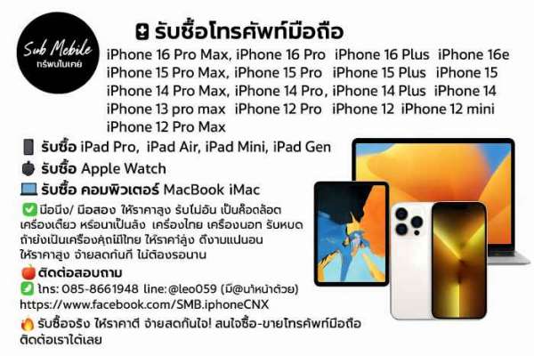 📢✅หากคุณกำลังมองหา ร้านรับซื้อ iPhone iPad Macbook ในเชียงใหม่ มีหลายร้านที่ให้บริการ เช่นร้าน SMB.iphoneCNX ที่รับซื้อiPad มานานกว่า10ปีให้ราคาสูงและพร้อมจ่ายเงินสด ติดต่อสอบถามได้ทาง Facebook หรือ Line ID: @leo059 (มี @ นำหน้าครับ) Tel: 085-8661948