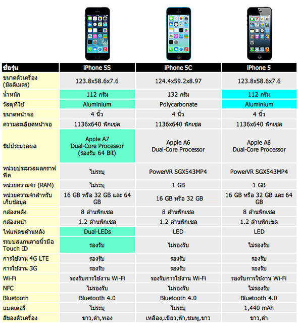 ตารางเปรียบเทียบสเปค ระหว่าง iPhone 5S, iPhone 5C และ iPhone 5