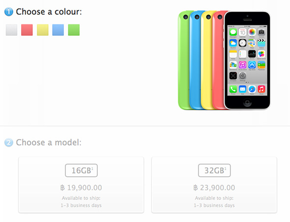 ในตอนนี้ iPhone 5c นั้นเริ่มวางจำหน่ายในประเทศไทยเรียบร้อยแล้ว โดยราคา ของ iPhone 5c จาก Apple Store Thailand นั้น จะเริ่มต้นที่ 19,900 บาท สำหรับรุ่น 16 GB และ 23,900 บาท สำหรับรุ่น 32 GB รวมถึง ยังคงสามารถซื้อจาก ผู้ให้บริการทั้ง 3 เจ้าในไทย เพื่อรับสิทธิ์ซื้อเครื่องในราคาพิเศษ พร้อมแพคเกจได้อีกด้วยครับ
