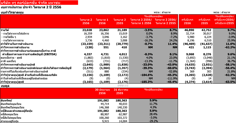 ทั้งนี้ กลุ่มทรูมีกำไรจากการดำเนินงาน ก่อนดอกเบี้ย ภาษี ค่าเสื่อมราคา และค่าตัดจำหน่าย หรือ EBITDA เพิ่มขึ้นร้อยละ 8.1 เมื่อเทียบกับไตรมาสเดียวกันปีก่อนหน้า เป็น 4.3 พันล้านบาท ส่วนใหญ่จากรายได้ที่เพิ่มขึ้นของทั้งสามธุรกิจหลัก ซึ่งช่วยชดเชยค่าใช้จ่ายที่เพิ่มสูงขึ้นจากการขยายและดูแลโครงข่ายและการทำตลาดเพื่อขยายฐานลูกค้าและกระตุ้นให้ลูกค้าใช้บริการเพิ่มมากขึ้น โดยในไตรมาส 2 ปี 2556 กลุ่มทรูรายงานผลขาดทุนสุทธิจากการดำเนินงานปกติ (NIOGO) ไม่รวมภาษีเงินได้รอตัดบัญชี เพิ่มขึ้นเป็น 2.2 พันล้านบาท จากการดำเนินการด้านการตลาดและการขายเชิงรุกอย่างต่อเนื่อง รวมถึงจากค่าเสื่อมราคา ค่าตัดจำหน่าย และดอกเบี้ยจ่ายที่เพิ่มขึ้นด้วย