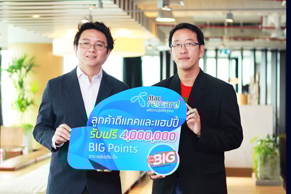 5 พฤศจิกายน 2556 - ปกรณ์ มโนรมย์ภัทรสาร (ซ้าย) ผู้อำนวยการฝ่ายการตลาดธุรกิจโพสต์เพด บมจ. โทเทิ่ล แอ็คเซ็ส คอมมูนิเคชั่น (ดีแทค) ร่วมด้วย อาทิตย์ จิตต์จุฬานนท์ (ขวา) ผู้อำนวยการฝ่ายการพาณิชย์โครงการสะสมแต้ม ประเทศไทย บริษัท ทูนมันนี จำกัด มอบสิทธิประโยชน์แก่ลูกค้าดีแทครีวอร์ด จับมือแอร์เอเชีย บิ๊ก มอบ 1,000 BIG Points เพียงลูกค้าดีแทคและแฮปปี้สมัครบิ๊กช็อตไอดีที่แอร์เอเชีย บิ๊ก แล้วนำเลขที่บิ๊กช็อตไอดี มาลงทะเบียนผ่านเว็ปไซต์ของดีแทค ตลอดเดือนกันยายน ถึง ธันวาคม 2556 รับ 1,000 BIG Points ฟรี เพียง 1,000 ท่านแรกของทุกเดือน รวมทั้งสิ้น 4,000,000 Big Points และพิเศษ ...แอร์เอเชีย บิ๊ก ได้จัดสรรเส้นทางบินเพื่อให้ลูกค้าดีแทคและแฮปปี้สามารถเข้าไปแลกคะแนน ในอัตราพิเศษ เริ่มต้นเพียง 500 BIG Points เพื่อเดินทางทั้งในและต่างประเทศไปกับแอร์เอเชีย ลูกค้าสามารถดูรายละเอียดเพิ่มเติมได้ที่ www.dtac.co.th