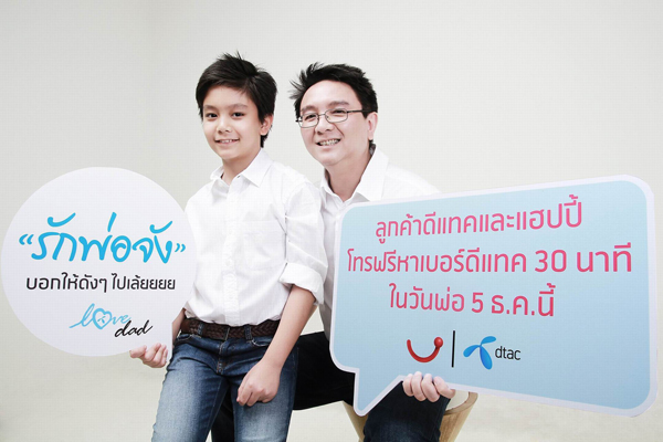 2 ธันวาคม 2553 - บริษัท โทเทิ่ล แอ็คเซ็ส คอมมูนิเคชั่น จำกัด (มหาชน) หรือ ดีแทค จัดแคมเปญสุดน่ารัก love dad ฉลองวันพ่อปีนี้ ชวนลูกค้าทั้งดีแทคและแฮปปี้โทรบอกรักพ่อดังๆ ฟรี 30 นาที ในวันที่ 5 ธันวาคม 2556 (เฉพาะเบอร์ดีแทค) ซึ่งจะทำให้ลูกได้บอกรักพ่อกับวันที่สุดแสนพิเศษ ง่ายๆเพียงกดรับสิทธิ์โทร *5000# จำกัด 1 เบอร์ต่อ 1 สิทธิ์ สามารถกดรับสิทธิ์ได้ตั้งแต่วันนี้จนถึง 5 ธันวาคมนี้และสามารถใช้สิทธิ์โทรฟรีได้จนถึงเที่ยงคืนของวันที่ 5 ธันวาคม 2556 ทั้งลูกค้าดีแทคและแฮปปี้สามารถดูรายละเอียดเพิ่มเติมได้ที่ www.dtac.co.th