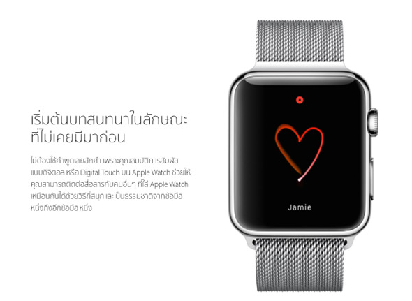 ระบบ Digital Touch บน Apple Watch ช่วยให้คุณสามารถติดต่อสื่อสาร กับคนอื่นๆ ที่ใช้งาน Apple Watch ด้วยรูปแบบใหม่ๆ ไม่ว่าจะเป็นการวาดด้วยนิ้วเพื่อส่งข้อความเชิงสัญลักษณ์ ไปจนถึง ส่งอัตราการเต้นของหัวใจคุณไปยังเพื่อนของคุณเป็นต้น