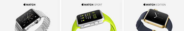 สำหรับ Apple Watch นั้นจะมีให้เลือก 3 รุ่น นั่นก็คือ Apple Watch, Apple Watch Sport และ Apple Watch Edition ซึ่งจะแตกต่างกันในเรื่องของตัวเรือน ที่ใช้วัสดุแตกต่างกันออกไป โดยสำหรับ Apple Watch Sport จะใช้วัสดุที่แข็งแรงกว่า รุ่น Apple Watch เล็กน้อย ส่วนรุ่น Watch Edition จะใช้วัสดุเป็นทองคำ 18 กะรัต