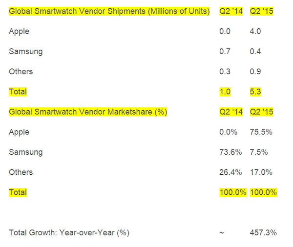 รายงานดังกล่าวได้ประมาณการยอดจำหน่าย Apple Watch อยู่ที่ประมาณ 4 ล้านเรือนในไตรมาสที่ผ่านมา ซึ่งถือเป็น 75 % ของส่วนแบ่งในตลาดทั่วโลก โดย Apple Watch วางจำหน่ายใน 16 ประเทศหลักทั่วโลก และเล็งเห็นถึงการเจาะกลุ่มลูกค้าที่เป็นแฟนพันธุ์แท้ของ iPhone ให้หันมาสนใจ Apple Watch นี้ด้วย ทั้งในตลาดอเมริกา และตลาดอื่นๆ ส่งผลให้ Apple กลายเป็นผู้นำในตลาด Smartwatch ของโลก ณ ตอนนี้