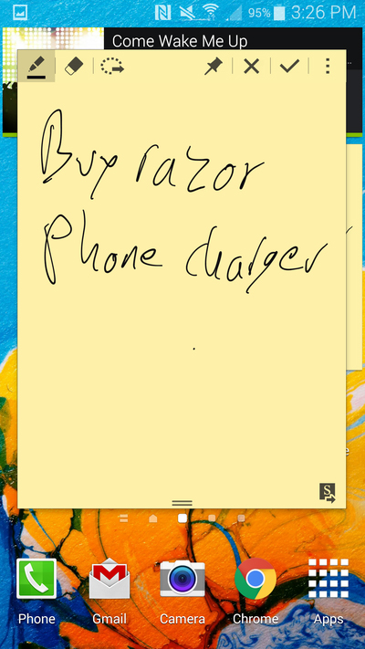 คุณยังเลื่อนหน้าจอด้วย S Pen ได้อยู่เหมือนเดิม นี่เป็นอย่างหนึ่งที่ซัมซุงยังคงเอกลักษณ์เอาไว้ (อาจเป็นเพราะว่า S Pen เป็นจุดเด่นที่ฉีกแนว Note 4 ออกจาก iPhone 6 Plus ก็ได้) ซัมซุงได้ปรับปรุงและทำให้ S Pen ใช้งานได้ง่ายขึ้น ดังที่ผู้บริหารซัมซุงบอกผมว่าผู้ใช้ส่วนใหญ่ยังสับสนว่าจะใช้ปากนี้ทำอะไรอีกนอกจากวาดภาพ คุณยังใช้ S Pen ของ Note 4 วาดภาพได้อยู่เหมือนเดิม แต่เพิ่มคุณลักษณะการอ่านแรงกดที่ละเอียดและแม่นยำมากขึ้นกว่าเคย ถ้าคุณไม่ถนัดงานศิลป์ ก็แค่ใช้ปากกานี้กดไปยังส่วนต่างๆ ของโทรศัพท์โดยไม่ต้องทำหน้าจอเปื้อนลายนิ้วมือหรือเจอปัญหาใช้งานยากเพราะนิ้วมือใหญ่กว่าปุ่ม (ซัมซุงกล่าวว่าผู้ใช้ส่วนมากมักเจอปัญหานี้) ปากกานี้สามารถเน้นสีข้อความได้ง่าย ใช้จิ้มมุมซ้ายบนของหน้าจอเพื่อลากและย่อแอพที่เปิดอยู่ และเปิดแอพที่ด้านล่างเพื่อดูเบอร์โทรศัพท์ในเบราว์เซอร์ขณะกดโทรออกในแอพโทรศัพท์ นอกจากนี้ยังแปะโพสต์อิทไว้ที่หน้าจอหลักเพื่อใช้จดรายการซื้อของเข้าบ้านหรือเบอร์โทรศัพท์ได้ ตัวผมเองไม่ค่อยได้แตะ S Pen มากนัก (เช่นเดียวกับผู้ใช้ส่วนมากที่พบจากข้อมูลของซัมซุง) แต่ปากกาด้ามนี้ให้ประโยชน์กับผู้ใช้ทั่วไปมากกว่าที่เคยเป็นมา