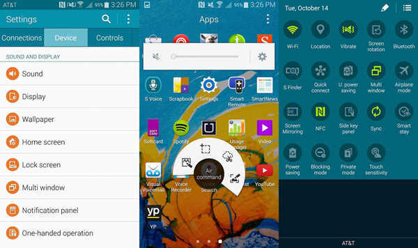 Note 4 ไม่ได้มีหน้าจอหลักให้เลือกมากมายพร้อมวิดเจ็ตและไอคอนรุงรังพร้อมบริการจากซัมซุงอีกต่อไป (แม้จะยังมีหลงเหลืออยู่บ้างเพราะซัมซุงคงยังอดใจไม่อยู่ แต่เท่าที่เห็นก็ดูน้อยลงมากแล้ว) แต่กระนั้นก็ยังมีตัวเลือก การตั้งค่า และการปรับแต่งต่างๆ ที่ชวนมึน โชคดีที่ซัมซุงซ่อนเอาไว้ในเมนูจุดสามจุดซึ่งผู้ใช้หลายคนคงไม่ทันได้สังเกตแน่ คุณยังเปิดใช้ Smart Stay ที่ตรวจจับสายตาของคุณเพื่อเปิดหน้าจอเอาไว้ขณะที่มองอยู่ แต่ตอนนี้คุณลักษณะนั้นเริ่มหายากขึ้นและทำลืมไปได้ง่ายขึ้นด้วย อีกส่วนที่หายไปคือกลไกการเลื่อนหน้าจอระดับสายตาแบบเอียง ทำให้คุณเลื่อนนิ้วสบายๆ แบบที่ชอบได้แล้ว
