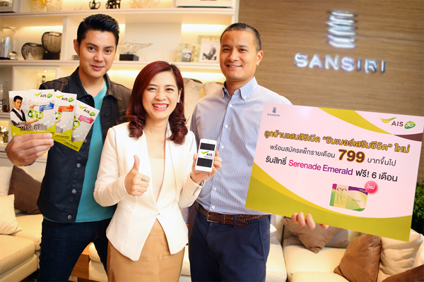 เอไอเอส โดย นางเบญจพร กำเพ็ชร ผู้อำนวยการฝ่ายการตลาดกลุ่มลูกค้าทั่วไป ร่วมกับ แสนสิริ โดย นายสมัชชา พรหมศิริ ผู้อำนวยการฝ่ายการตลาดองค์กร มอบสิทธิพิเศษให้แก่สมาชิกครอบครัวแสนสิริ แฟมิลี่ (Sansiri Family) เพียงเปิด ซิมเบอร์เสริมชีวิต ซึ่งช่วยเสริมพลังบวกในทุกด้านของชีวิตถึง 3 รูปแบบ ทั้งร่ำรวยและรักรุ่ง , งานเด่นและปัญญาดี และสุขภาพดีและงานเด่น ที่คัดพิเศษโดย แมน การิน หรือ แมน แมธเธโลจี นักออกแบบตัวเลขอันดับ 1 ของเมืองไทย พร้อมสมัครแพ็กเกจรายเดือน 799 บาท ขึ้นไป รับสิทธิ์ เซเรเนด เอมเมอรัลด์ ได้ฟรี 6 เดือน ทันที เพื่อร่วมสัมผัสประสบการณ์ความพิเศษที่รองรับการใช้ชีวิตทุกไลฟ์สไตล์ ตั้งแต่วันนี้ 31 ธ.ค. 57 ที่เอไอเอส ช็อป สอบถามรายละเอียดเพิ่มเติมได้ที่ เอไอเอส คอลล์ เซ็นเตอร์ 1175